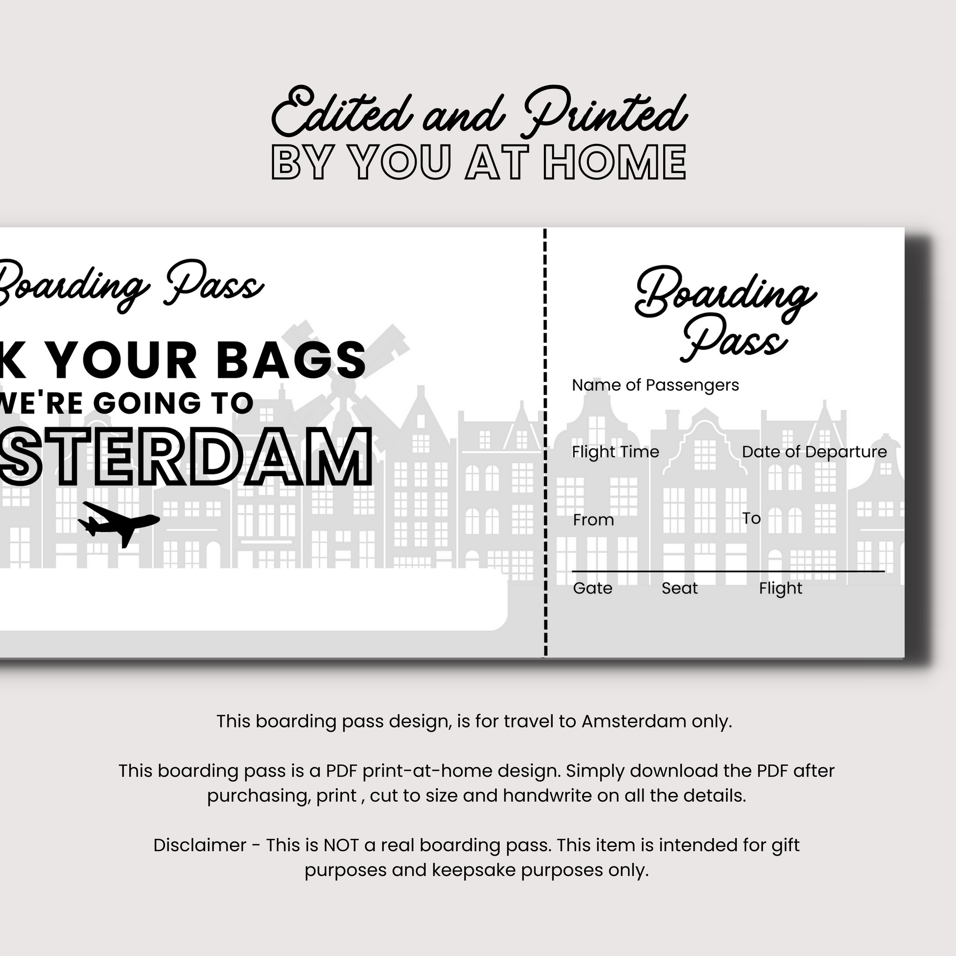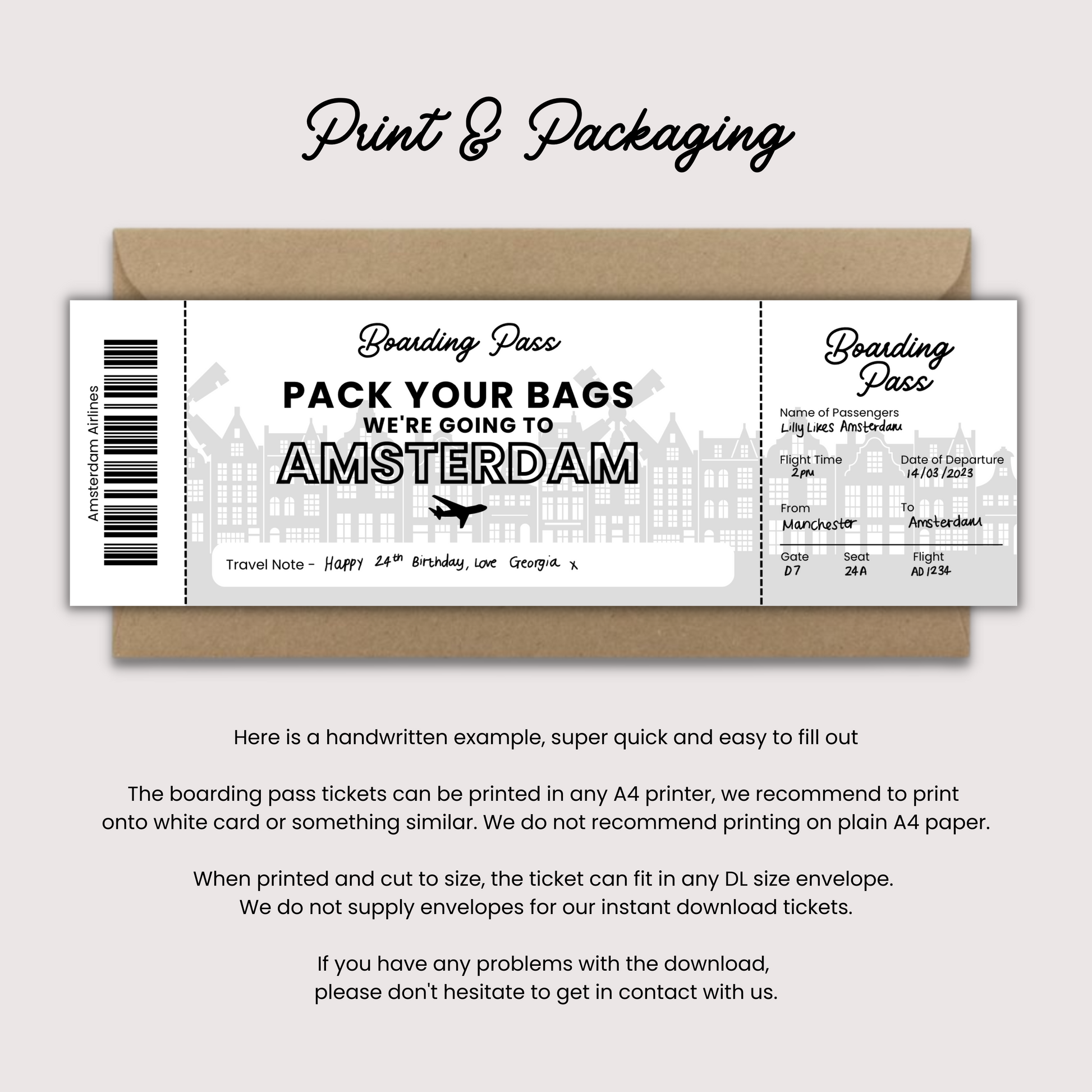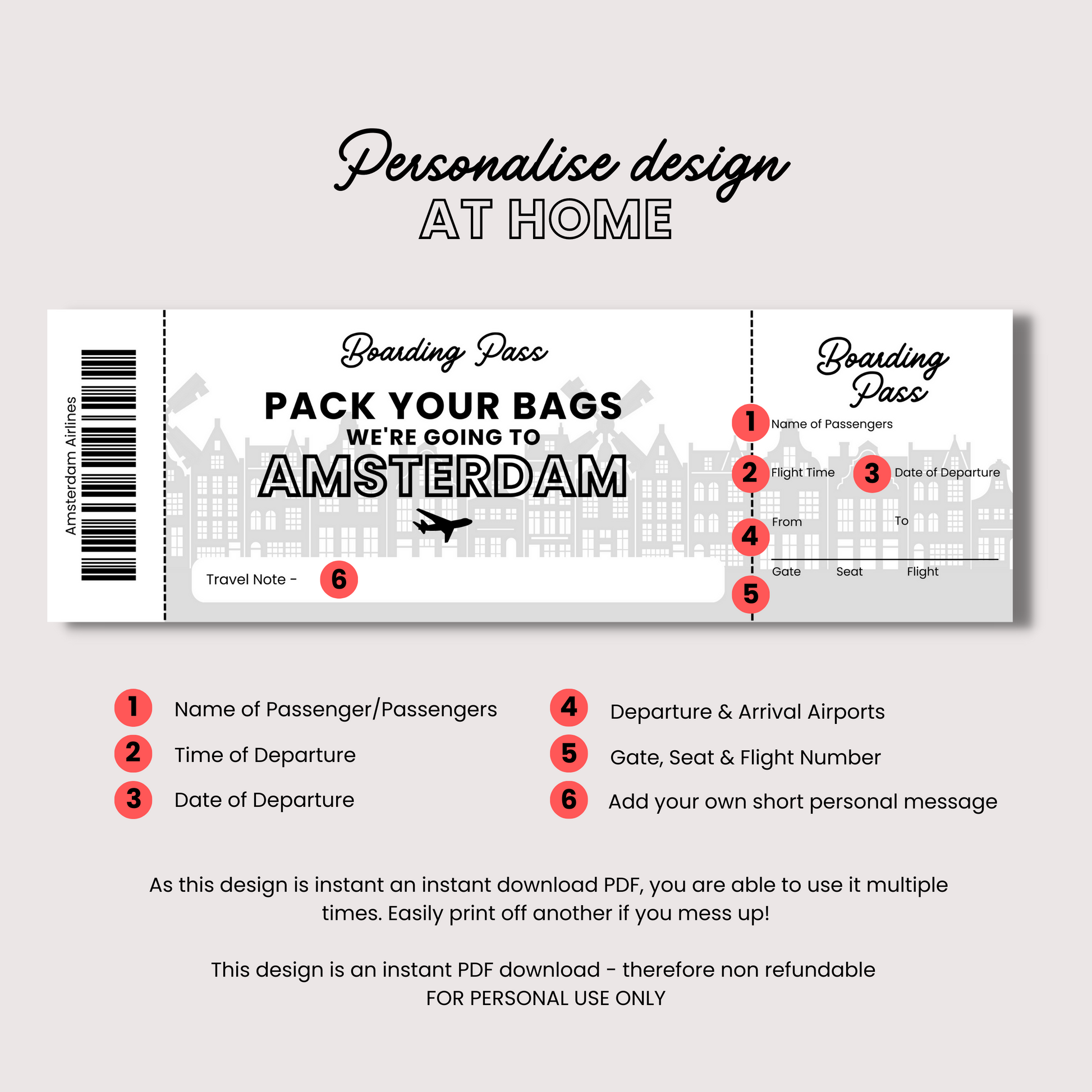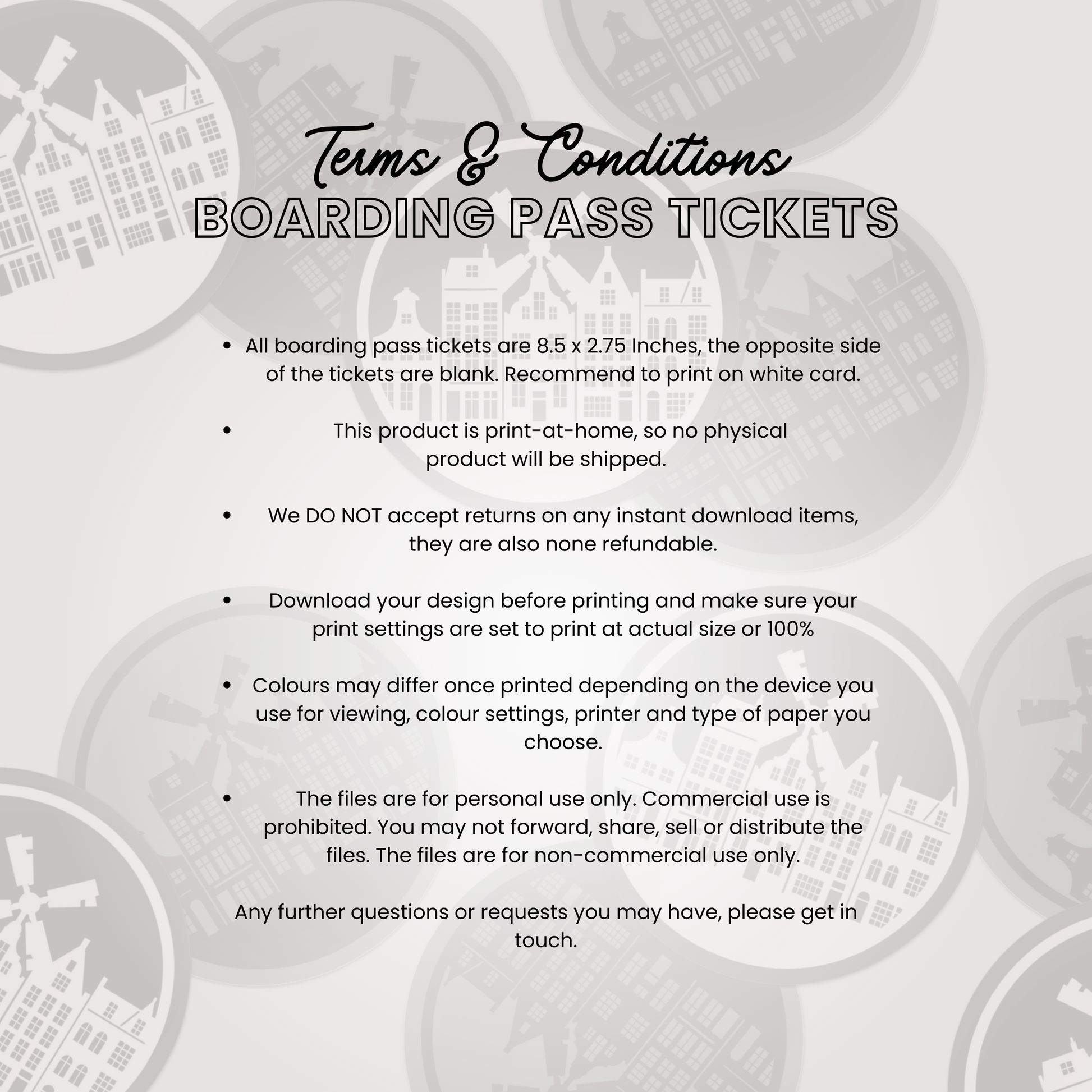 This ticket is a print at home download that we will send via email as a PDF. The ticket of choice include fields such as "Passenger Name," "Flight Number," "Departure Date and Time," "Gate," and "Seat Number," that you will print at home and fill out yourself. The downloadable file is a one time purchase, so after purchase you can use this file as many times as you would like.